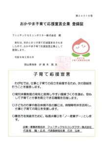 このたび当社は、岡山県知事より「おかやま子育て応援宣言企業」として登録されました。